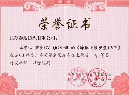 同時,公司QC小組攜此課題參加了2013年“泰州移動杯”QC小組質(zhì)量成果大賽并最終入選。2013年9月26日,泰州市質(zhì)量技術(shù)監(jiān)督局特邀有關(guān)領(lǐng)導(dǎo)和專家擔(dān)任評委,對各企業(yè)入選成果進(jìn)行評審。最終,我公司“降低成紗重量CV%”QC小組榮獲二等獎,這是姜堰區(qū)入選企業(yè)榮獲的最高名次,亦是泰州全市、區(qū)范圍內(nèi)紡織企業(yè)獲獎的最高名次。