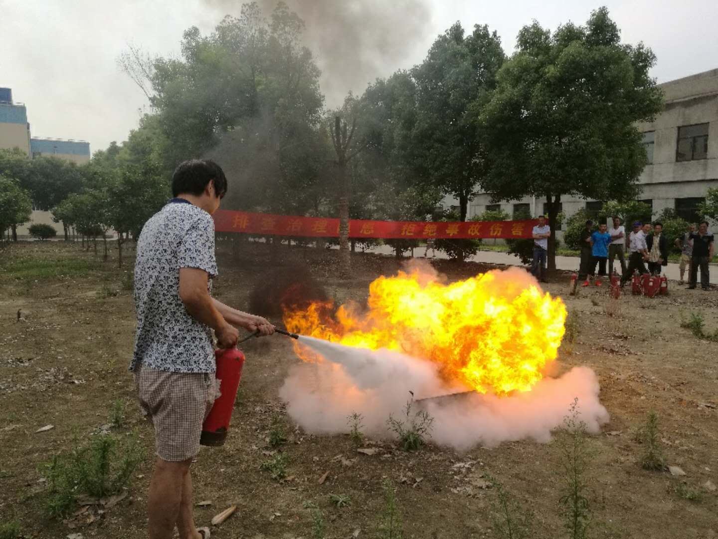 在消防安全知識培訓(xùn)結(jié)束后,消防員錢國圣、潘長昭組織大家進行油盆滅火消防演練。